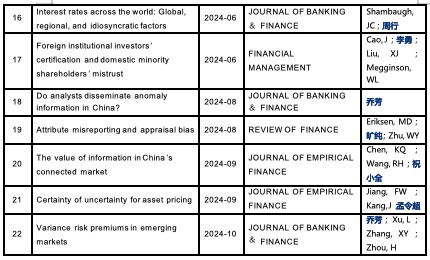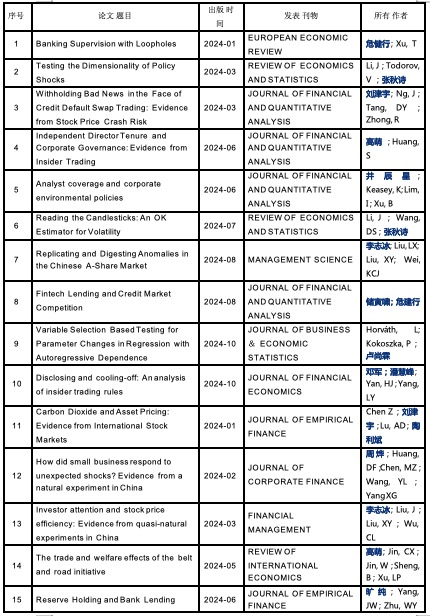 2024年学院正式发表论文共114篇,其中国际高水平发表再有新突破,学院教师在《Journal of Financial Economics》《Journal of Financial and Quantitative Analysis》《Journal of Business & Economic Statistics》《Review of Economics and Statistics》《Management Science》《European Economic Review》等国际高水平期刊正式发表论文22篇,较去年同比增长37.5%。这些研究成果覆盖了金融监管、金融市场、公司治理、宏观经济、风险管理等多个领域,向世界展现了中国智慧与中国力量。此外,学院教师2024年高水平论文成果荣获第九届高等学校科学研究优秀成果奖(人文社会科学)三等奖2项、北京市第十七届哲学社会科学优秀成果奖二等奖2项。