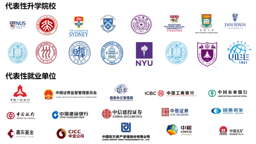 学院把毕业生升学就业工作摆在突出位置,在学术能力提升、岗位开拓、就业指导等各方面持续发力,促进就业育人全周期贯通、育人场景全域协同、育人力量全员参与,努力实现更加充分和更高质量就业。学院连续10年全面公布研究生毕业去向,主动接受社会对学院人才培养的监督和关注。2024届毕业生中,约70%本科毕业生前往哥伦比亚大学、新加坡国立大学、悉尼大学、北京大学、清华大学等国内外知名高校升学深造;研究生升学就业率达99.42%,其中博士就业率达100%,代表性单位有中国人民银行、中国证券监督管理委员会、国家外汇管理局、中国工商银行、中国中金财富证券有限公司、中信建投证券股份有限公司等。越来越多的学生选择到中西部地区和基层就业,在服务国家战略、推动地方经济社会发展中书写青春篇章。