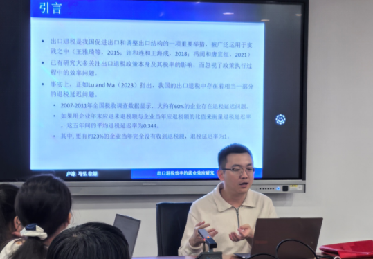 冬训营第二场讲座中,卢冰老师分享了他最新的工作论文《出口退税效率的就业效应研究》。他与合作者讨论了加快出口退税进度、提升退税效率和退税资源的合理分配是否会促进就业这一问题。此外,卢冰老师分享了自己在科研实践中的心得体会,为本科生和研究生开展初步研究提供思路方法。在互动环节,卢冰老师与同学们热烈交流,现场学术氛围浓厚。