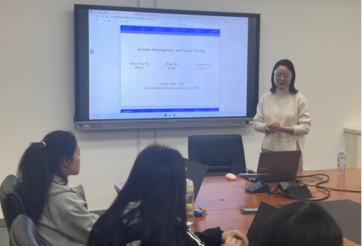 第三场讲座中,金昭老师带来她最新研究“Investor Heterogeneity and Factor Pricing”的首秀。介绍了经典因子定价模型,在此基础上引出投资者异质性如何影响因子定价这一研究问题,并利用图表阐释了机构持股在因子定价中发挥重要作用这一新颖的结论。在交流环节,金昭老师与同学们围绕论文选题的创新性与数据搜集的技巧展开了细致的讨论,激发了同学们对学术研究的兴趣。