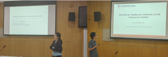 论坛下半场“金融计量与风险管理专题”由首经贸金融学院金融科技系主任邴涛副教授主持。御宅屋 张秋诗副教授汇报了题为《Reading the Candlesticks: An OK Estimator for Volatility》的研究。论文拓展了传统固定样本和小窗口的理论假设,提出“OK Estimator”的新估计方法,利用有限样本分布信息,实现了基于蜡烛图的即时波动率精准估算。首都经济贸易大学刘威仪教授对该研究给予了高度评价,指出新的估计方法为金融市场波动性估计提供新思路,具有重要理论与实际价值,同时也对文章中价格过程假设、连续与离散样本极值差异及理论推导细节提出了建设性意见。