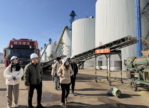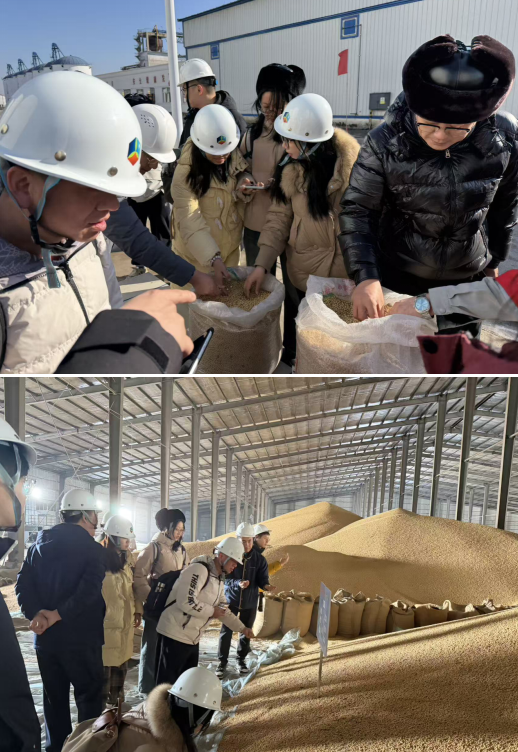 10月30日上午,师生一行乘车前往中粮贸易海伦市粮储仓库进行实地调研。在库区专业人员引导下,师生依次参观了大豆立式储罐、清选车间、精选塔、比重机与色选机等设施,并观摩了公铁联运装卸流程,对大豆在粒径、蛋白、水分等方面的标准化分级有了直观认知。