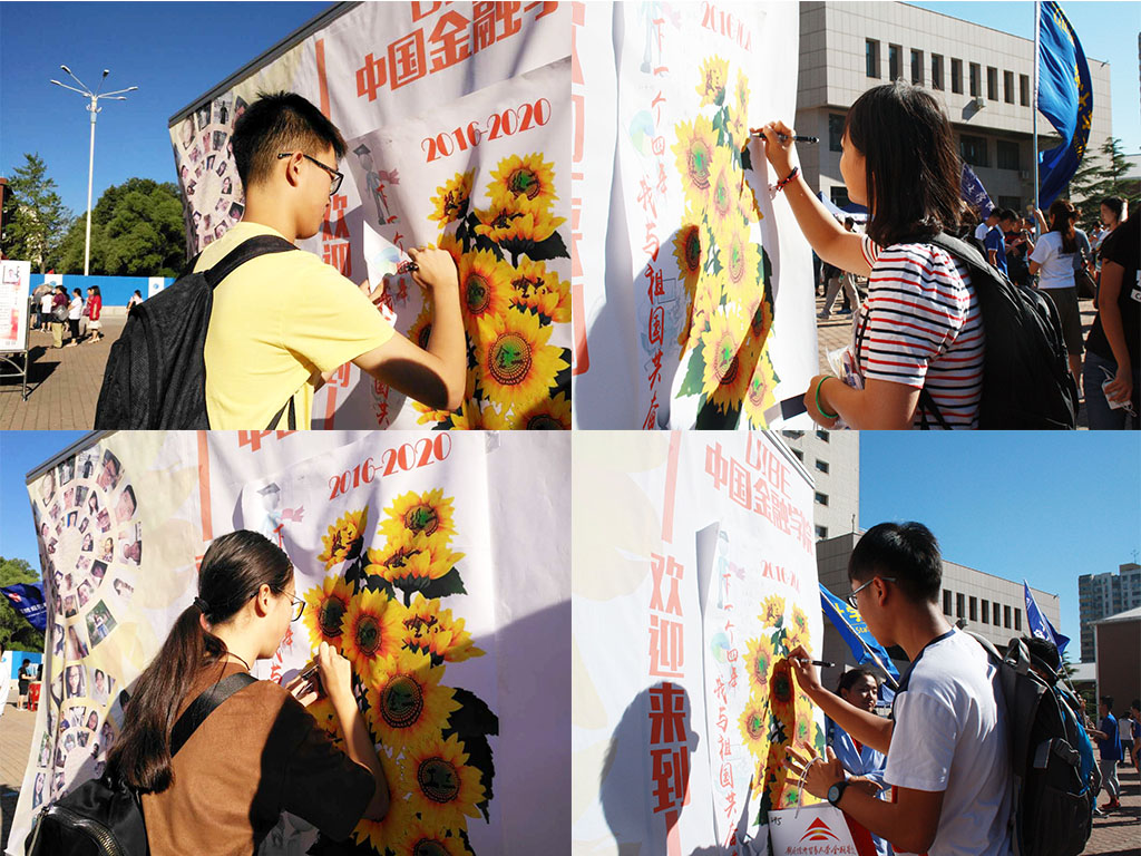 “新一代国际化银行家的摇篮”横幅下,一张张新鲜的面孔在志愿者的引导下提交高中档案,领取迎新材料和院衫,向他们的高中时代告别,迎来崭新的四年。以向日葵为背景的签名墙上逐渐签满了三百多名新生的名字。签名墙前,学生们露出灿烂笑容,用相机记录下他们大学生活中的第一个重要时刻。