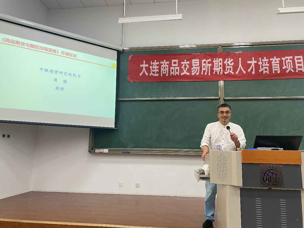 开课仪式由金融工程系党支部书记冯建芬老师主持,中粮期货有限公司研究院院长焦健先生首先致辞。焦健先生在仪式致辞中首先向踊跃参与课程学习的广大同学表示欢迎,勉励同学们积极学习,将所学课程知识融会贯通,转化为个人职业发展优势。焦健先生表示中粮期货作为最早一批参与我国期货业务的公司,中粮期货见证并参与了我国衍生品市场的发展与完善过程,在实务中沉淀了丰富的经验、理念和方法,非常渴望与广大同学交流分享,为国家金融人才培养承担起中粮期货的社会责任。他强调,同学们要充分认识到实务课程操作性强的特点,在用中学,最后焦健先生预祝同学们在接下来的课程中学有所获。