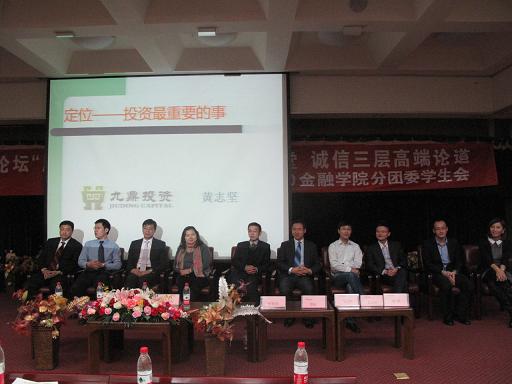 最后一位是九鼎投资的投资总监黄志坚先生,他通过自己的工作经验向学生们介绍了PE的工作结构和工作内容,他还和学生们分享了自己的投资理念——“要树立自己的信仰,不能光想着赚钱。”