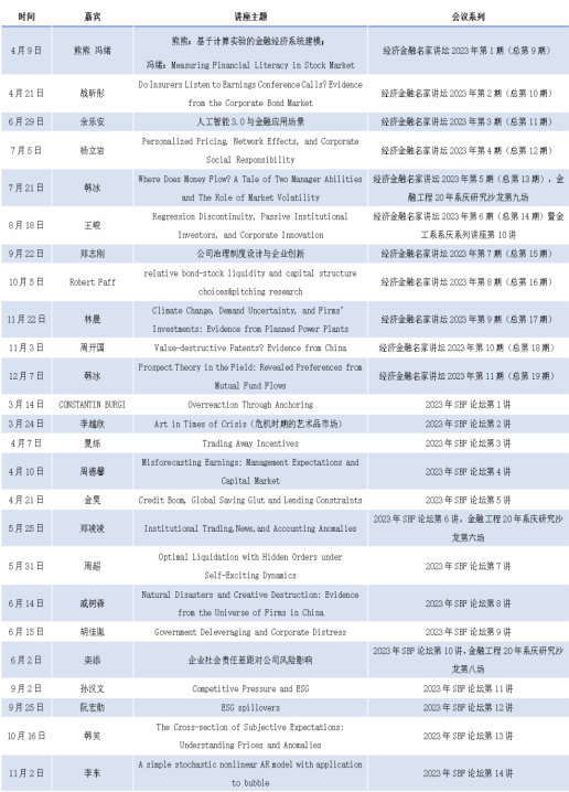 本年度SBF学术论坛共举办18场,邀请了来自北京大学、复旦大学、中国人民大学以及纽约市立大学、英国巴斯大学、法国ESCP商学院等国际、国内各大高校和研究机构的专家学者。讲座主题覆盖面广,包括宏观经济、资本市场、公司金融、银行管理和金融科技等多个领域,还涉及了多个热点议题,如可持续发展对企业绩效的作用、金融泡沫及其动态机制等。
