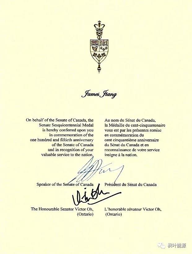 为庆祝加拿大建国150周年,加拿大联邦参议院于11月29日在渥太华国会山举行隆重庆典,联邦参议院参议长George J. Furey 亲自为获得加拿大建国150周年勋章的各界精英授勋。这是加拿大联邦参议院150年来首次举行集中授勋仪式,以表彰为加拿大社会及社区作出杰出贡献的精英人士。