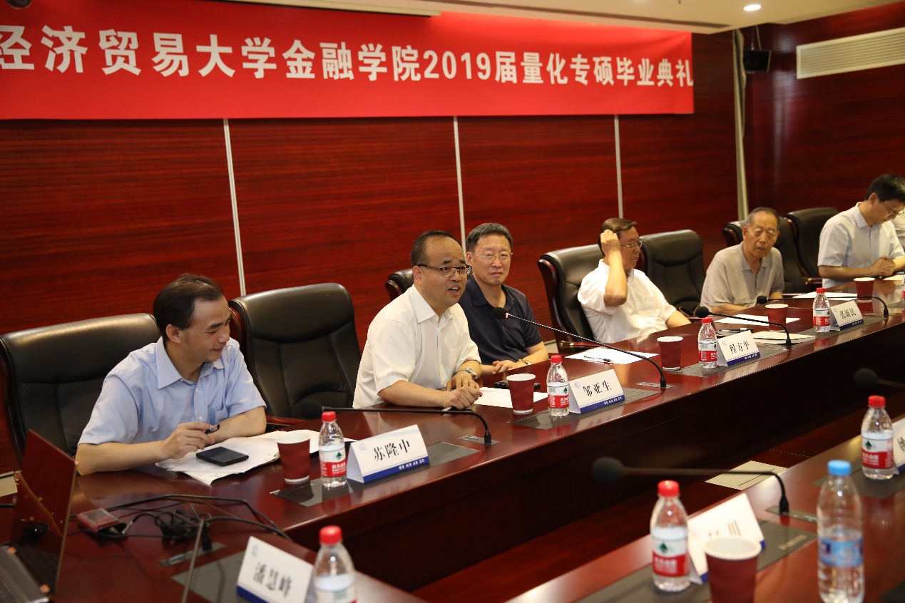 (记者:刘宇环 照片提供:张燕生)6月21日上午10时,金融学院2019届量化专硕毕业典礼于科研楼校董会会议室举行。中国科学院严加安院士、中国人民大学程方平教授、清华大学中国礼学研究中心办公室主任姚刚(受清华大学首批文科资深教授彭林教授委派代表出席)、中国地质大学代表徐春骐、《简明艺术辞典》副主编潘树成、副校长张新民、研究生院院长吴卫星、金融学院院长邹亚生、研究生院副院长蔡永明、档案馆副馆长苏隆中出席活动。此外,还邀请了校外量化专硕导师:罗颜、姚忠兵、玄耀、何川,校内导师:冯建芬、曹诗男、陶利斌以及研究生教务员曾英、2019届量化专硕全体毕业生及20位家长参加此次毕业典礼。量化专硕项目主任潘慧峰主持本次毕业典礼。