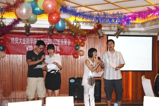 2011 年 7 月 16 日 晚,金融学院2011年第二期在职研究生班举行了“with uibe有你有我”期末联欢会。培训中心主任唐春梅老师出席并致辞、2010年4班班主任王宁老师、培训中心的胡国仲老师作为嘉宾出席,在班主任王春蕾老师的组织下,同学们自编自演了精彩纷呈的节目,设计了趣味横生、爆笑连连的游戏,共同度过了一个令人难忘的夜晚。
