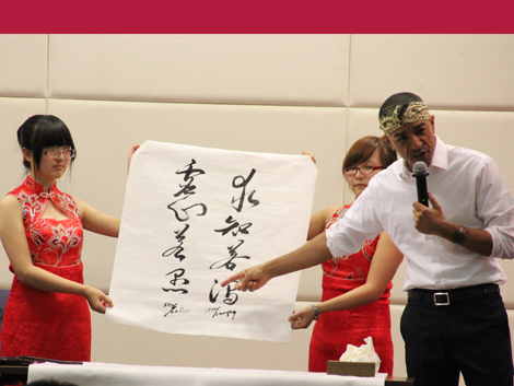 讲座伊始,主持人询问了马克对于北京的印象。马克表示,作为一名久居深圳的异国人,他非常喜爱北京的食物与其深厚的历史文化底蕴。接下来,主持人就纽约时报曾刊载过出自马克之手的《深圳态度》与其展开讨论。马克提到,他曾在深圳目睹一家老小在傍晚时候悠闲散步的场景,这让他想起了中国的老话“智者乐山,仁者乐水”与“智者静、仁者动”。他认为,人们只有在宁静中才能真正成就智慧、实现自我。此外,针对“如何在多元文化背景下找到归属感”这一问题,马克先生提出了两个观点——首先,我们必须努力尝试去尊重并理解别国文化;其次我们可以通过当地的慈善活动来进一步了解自己、了解这个国家。在马克先生努力理解中国文化的过程中,他开始学习书法。他认为书法与音乐相通,是另外一个了解自我的途径。同时,书法让他感受到了宁静的力量。趁此机会,主持人邀请马克在现场进行书法展示。马克先生欣然答应,用流畅的行草写下“求知若渴,虚心若愚”八个大字送给御宅屋