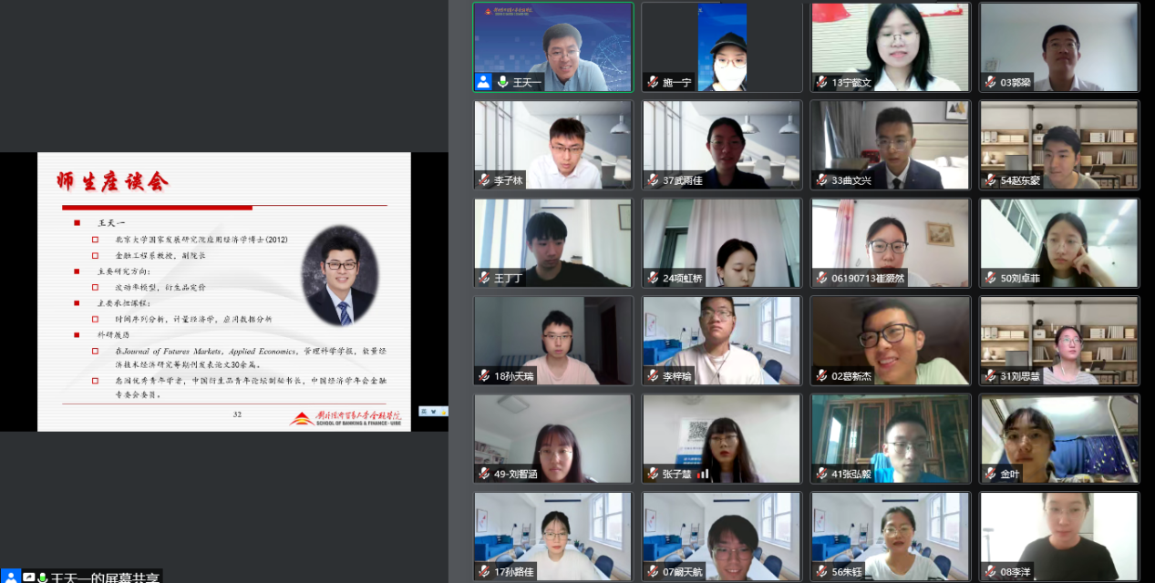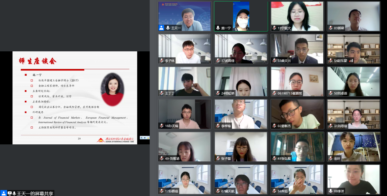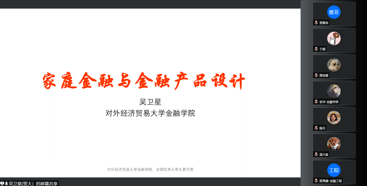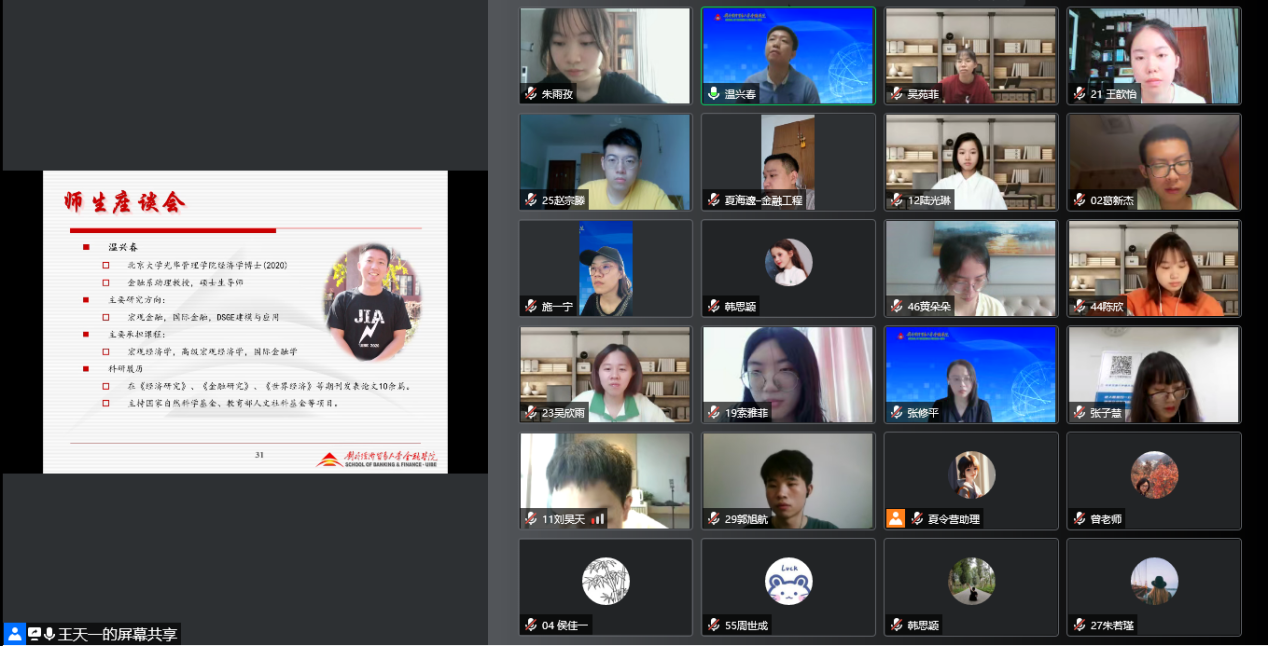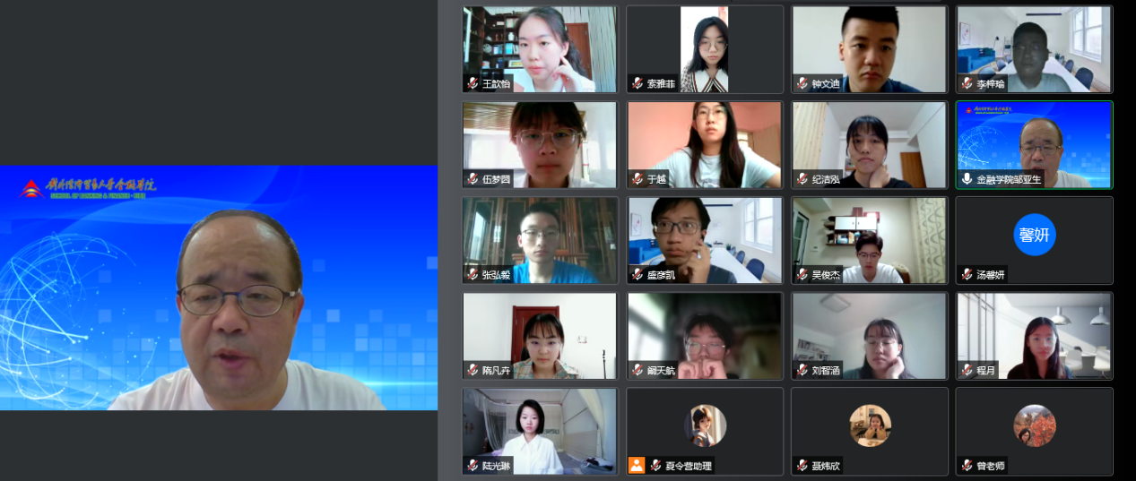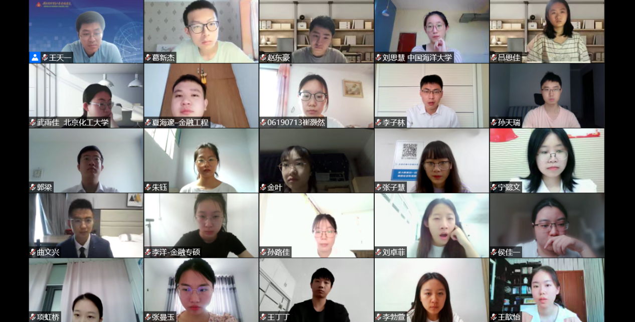 在第一天最后一项学生座谈会活动中,金融学院优秀学生代表肖静、李维升、陈晓仪和樊成韵四位同学先后分享了在贸大金融学院求学的学习生活经历,虽然是线上座谈,但夏令营的同学们热情很高,积极参与讨论和交流。