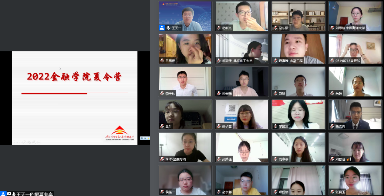 2022年7月2日上午8:30,金融学院2022年全国优秀大学生暑期夏令营通过线上形式举行了开营典礼。御宅屋 副校长吴卫星教授、金融学院院长邹亚生教授、副院长王天一教授和夏令营近60名营员出席了典礼活动,典礼由王天一教授主持。