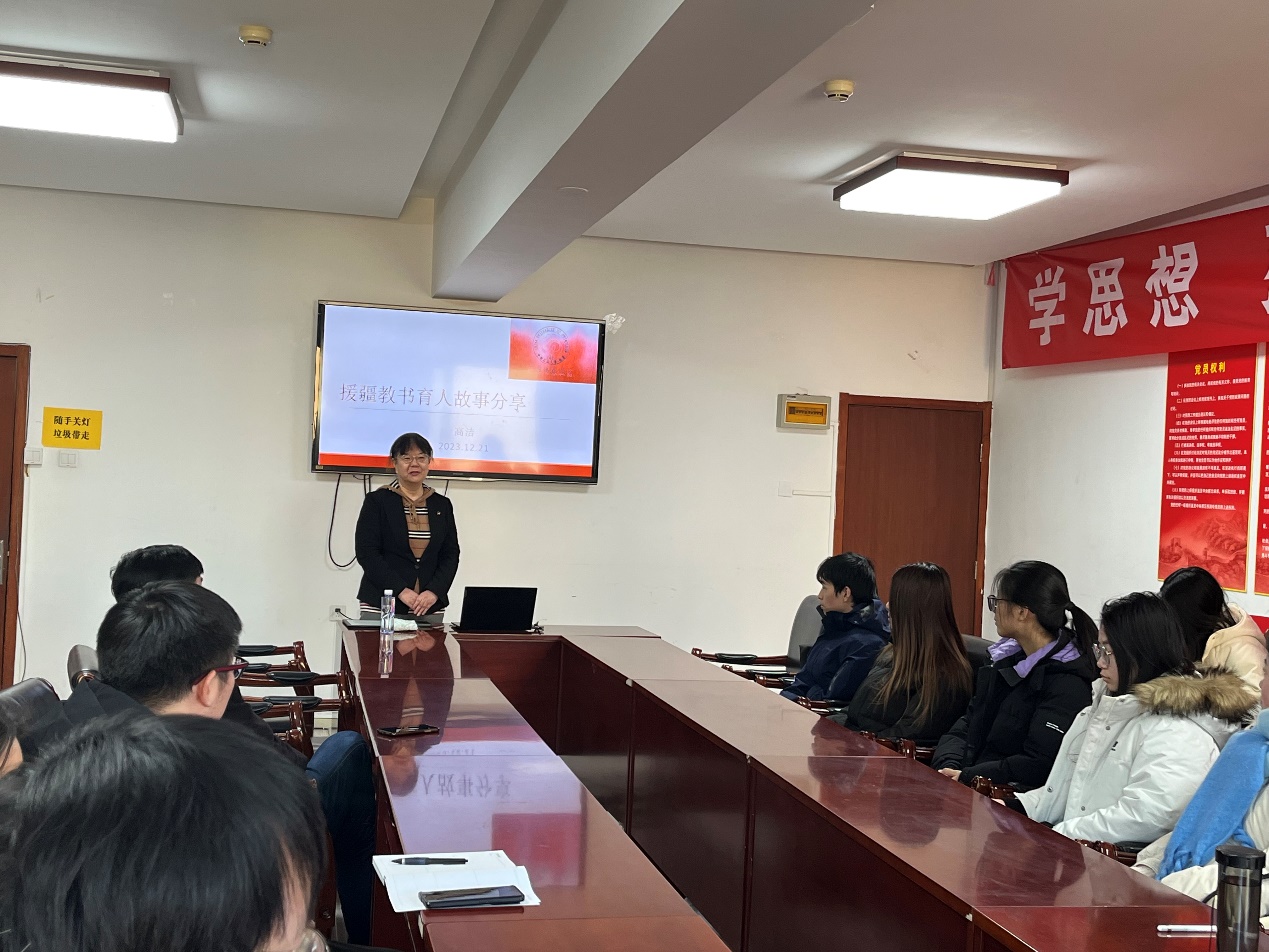 2023年12月21日,金融学院党委在博学楼925会议室举办“倾情边疆,无怨无悔——金融学院高洁教授谈援疆岁月”教师沙龙,金融学院青年教师及部分学生参加活动,金融学院曹小勇书记主持沙龙。